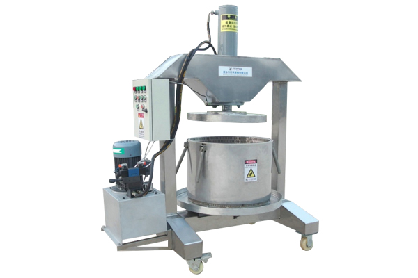 本機由機架、壓緊系統(手輪絲杠或者液壓系統)、活動壓板、接汁盤、框欄組成。接汁盤放在底盤上,框欄放在接汁盤上,裝料后將其放入機架的活動壓盤下,物料在活動壓盤的擠壓下榨出汁液。為了提高皮渣芯部的出汁率,在物料之間放有導流盤。汁液由接汁盤收集后經出汁管排出。