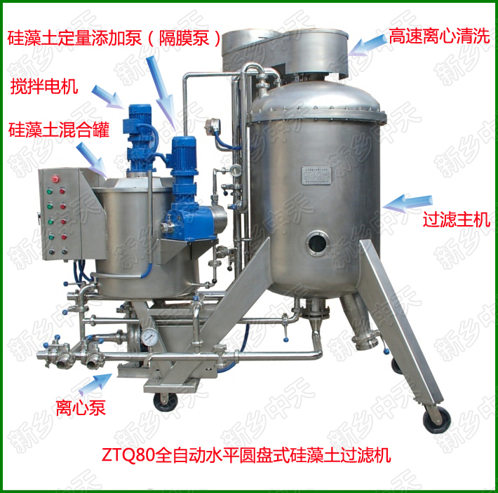過濾時,首先在過濾盤上形成硅藻土預涂層。被過濾的液體經硅藻土預涂層時,其中的雜質即被阻擋;而純靜的液體經過微觀管狀或片狀的間隙以及顆粒之間的間隙通過過濾層,從而起到過濾作用。隨過濾時間的推移,在預涂層上被濾掉的雜質會越來越多,且將阻塞過濾通道。因此在過濾過程中,還需對進入過濾罐的被過濾的液體,添加一定劑量相應粒度的硅藻土,以維持正常的過濾過程。另外,如果過濾時需要脫色,還需加入一定比例的活性炭。