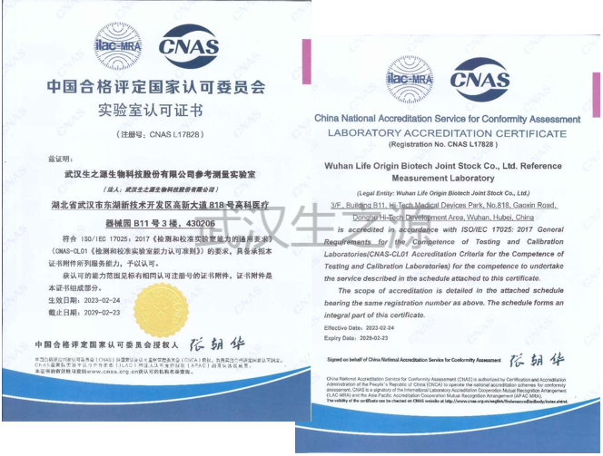 近日,武漢生之源生物參考測量實驗室獲得中國合格評定委員會(CNAS)正式頒發(fā)的認(rèn)可證書(CNAS-CL01+CNAS-CL07),成為湖北省第一家通過CNAS認(rèn)可的參考測量實驗室。